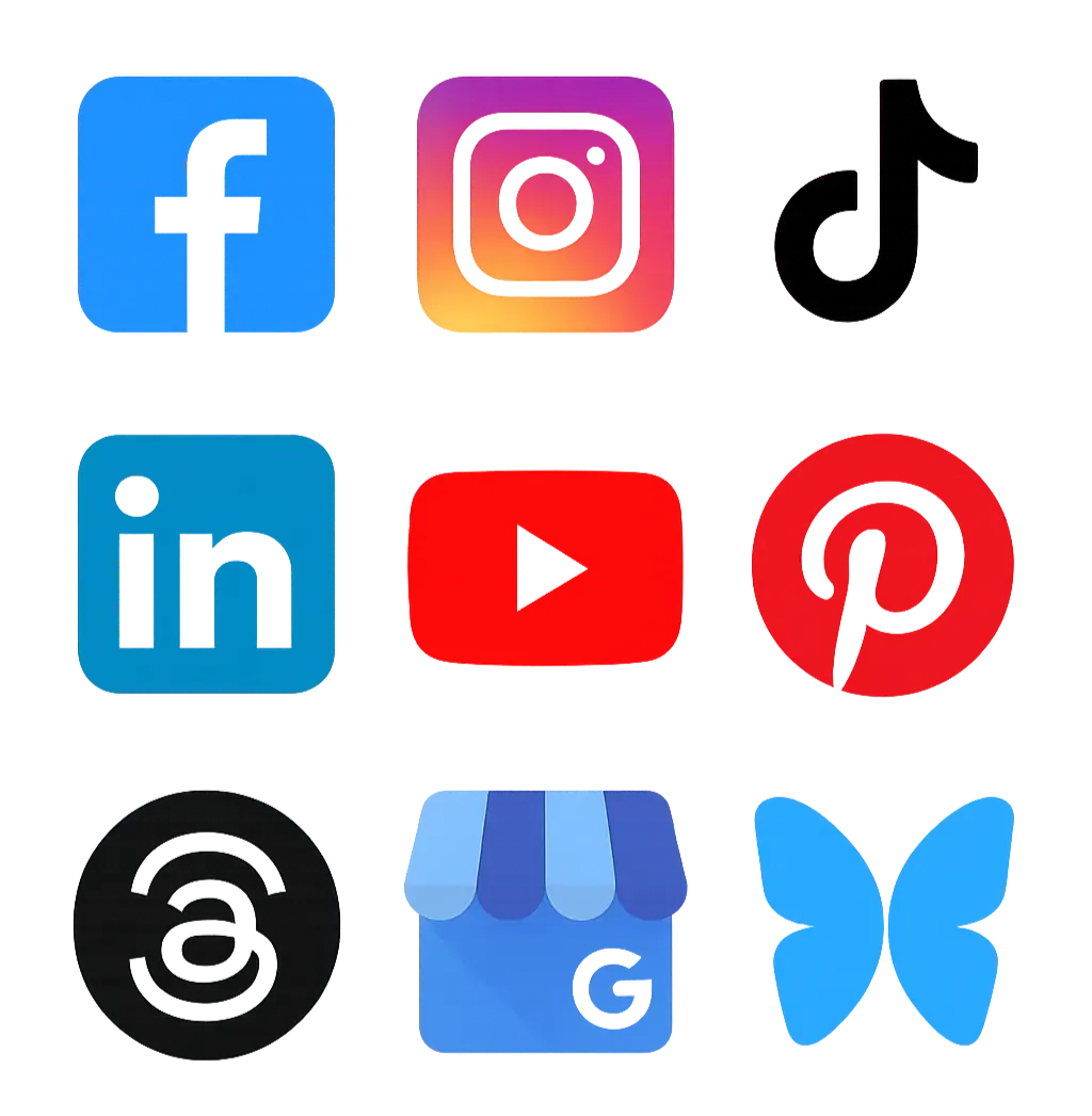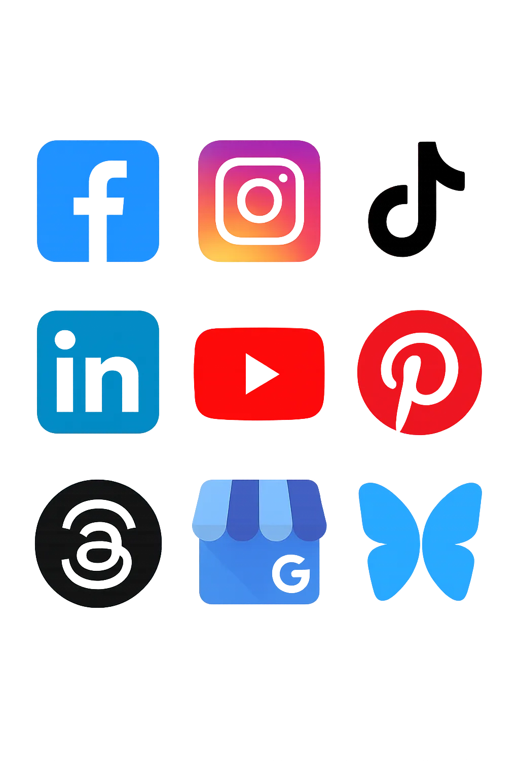Daily posting on Instagram, Facebook, Threads, TikTok, LinkedIn, Bluesky, YouTube, Pinterest and Google Business